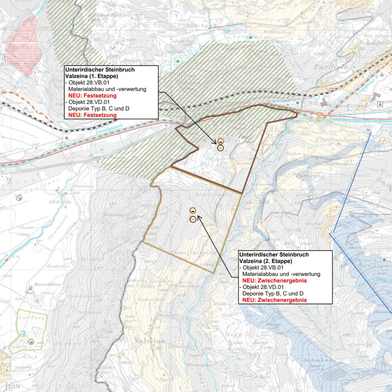 Mit dem Richtplaneintrag für den unterirdischen Steinbruch Valzeina, beim westlichen Eingang ins Prättigau, werden die richtplanerischen Voraussetzungen geschaffen, am Standort in grösserem Umfang Gestein abzubauen und damit den langfristigen Zugang zu Rohstoffressourcen sicherzustellen. Dabei entstehende Hohlräume sollen gemäss Projektvorhaben sukzessive für die Ablagerung von unverschmutztem Abbruchmaterial sowie als unterirdische Deponie genutzt werden.