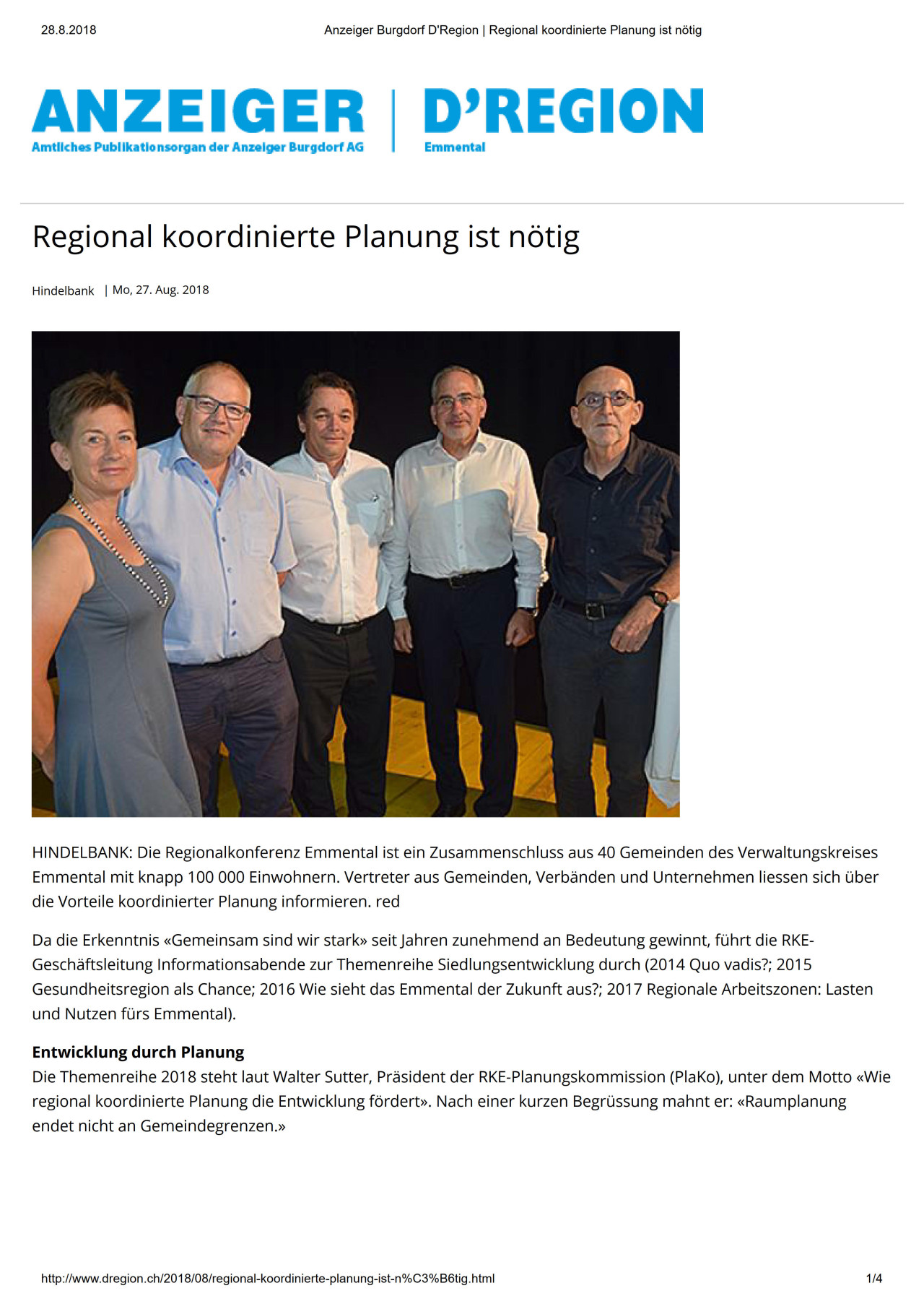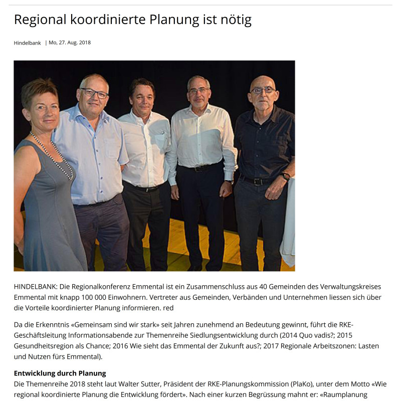 Christoph Zindel referierte anlässlich der alljährlichen Tagung der Regionalkonferenz Emmental vom 23. August 2018 zur Thematik, ob regional koordinierte Planung die Entwicklung fördert. Dabei vertrat er mit Überzeugung die These, dass eine solche Koordination in der Regel zu grösseren Organisationseinheiten mit mehr Ressourcen und grösserem Durchsetzungsvermögen führt. Allerdings ist er auch der Ansicht, dass letztlich die Innovationskraft ein noch stärkerer Wirtschaftstreiber ist. Ohne Innovation gibt es keine nachhaltige Entwicklung.
